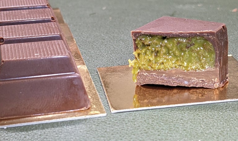 Unsere Produkte enthalten Kakaokerne aus Belize und Maracaibo, Pistazien, Mandeln, Kunafa-Teig und mehr.